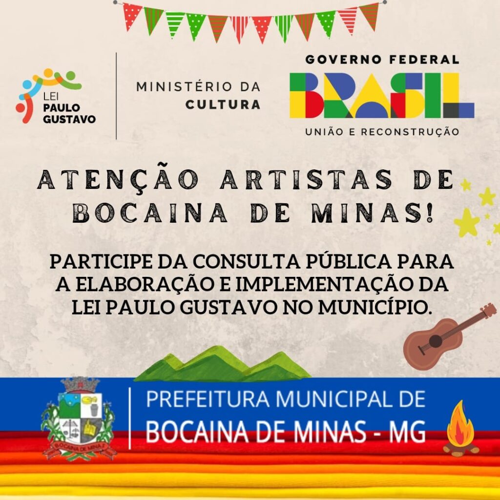 FORMULÁRIO DE CONSULTA PÚBLICA Este formulário será utilizado em consulta aos Agentes Culturais sediados no município de Bocaina de Minas. Respondendo a esta pesquisa, que visa subsidiar a construção das políticas culturais municipais e facilitar a comunicação para a elaboração dos editais da Lei Paulo Gustavo. CLIQUE AQUI PARA ABRIR O FORMULÁRIO