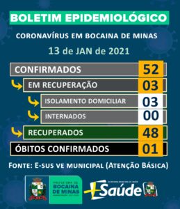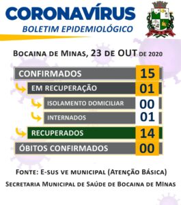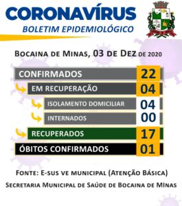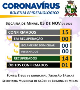 A Secretaria Municipal de Saúde de Bocaina de Minas informa, através do Boletim Epidemiológico de hoje (03/09/2020) a atualização dos casos do município.