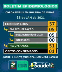 A Secretaria Municipal de Saúde de Bocaina de Minas informa, através do Boletim Epidemiológico de hoje (17/08/2020) a atualização dos casos do município.