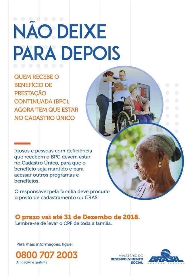 Portanto é de extrema importância que os idosos que recebem o BPC procurem IMEDIATAMENTE o CRAS (Centro de Referência de Assistência Social) para serem orientados e cadastrados, garantindo assim o recebimento normal do benefício.